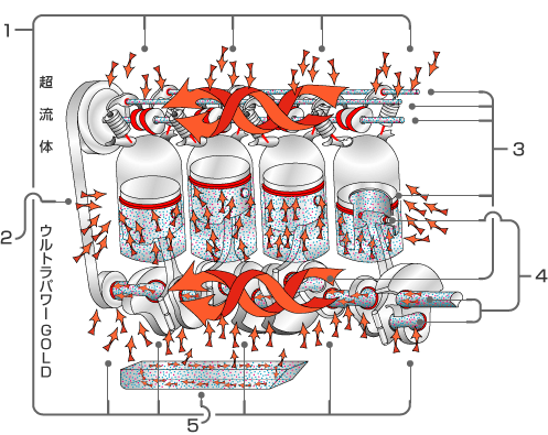 エンジン機関の下から上に一気に循環流動する超流体(粘弾性)が機関全体を包み込み、旺盛な潤滑力を発揮します。