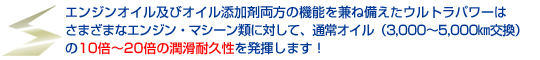 オイル潤滑が要求されるさまざまなエンジン・マシーン類に対して、すみやかな性能向上の変化を実現し、通常のオイル(3,000〜5,000キロ交換)の10〜20倍の潤滑耐久性を発揮します。